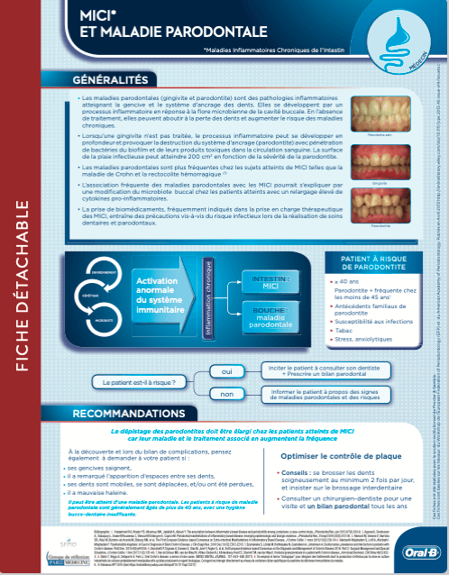 Les maladies parodontales (gingivite et parodontite) sont des pathologies inflammatoires atteignant la gencive et le système d’ancrage des dents. Elles se développent par un processus inflammatoire en réponse à la flore microbienne de la cavité buccale. En l’absence de traitement, elles peuvent aboutir à la perte des dents et augmenter le risque des maladies chroniques.
