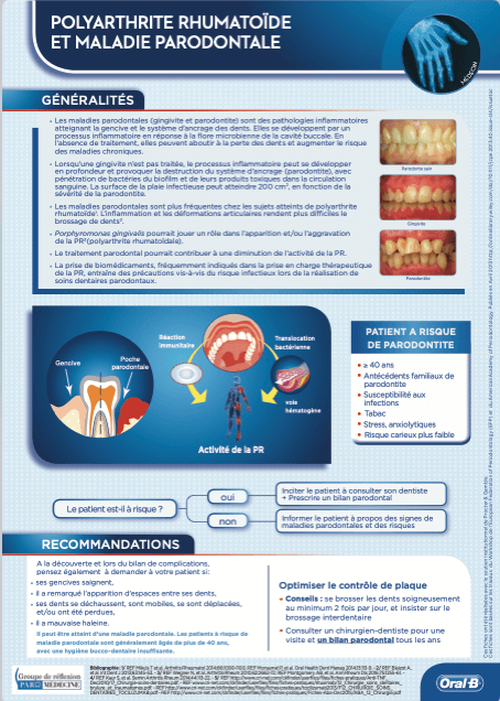 Les maladies parodontales (gingivite et parodontite) sont des pathologies inflammatoires atteignant la gencive et le système d’ancrage des dents. Elles se développent par un processus inflammatoire en réponse à la flore microbienne de la cavité buccale. En l’absence de traitement, elles peuvent aboutir à la perte des dents et augmenter le risque des maladies chroniques.